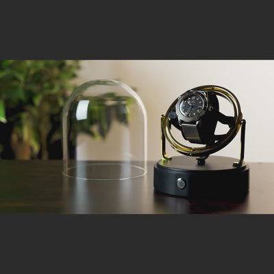 An almost mystical dance of metal around your timepiece, the Gyroscope echoes the motions of a tourbillon as it seamlessly winds your timepiece. This is no simple winder but an item of industrial wonder to behold on its own.